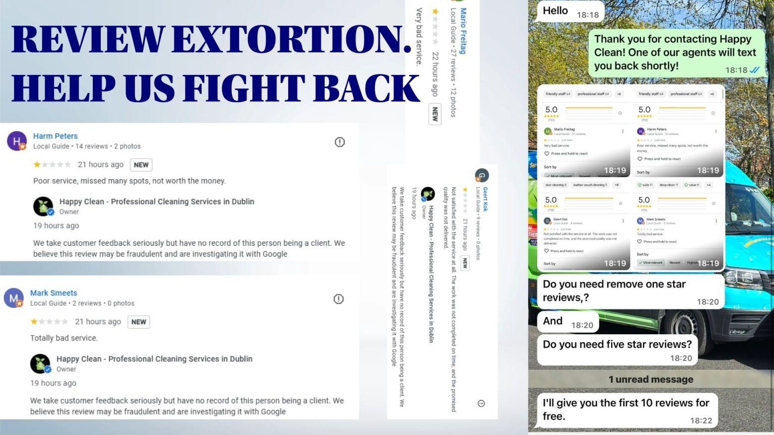 Industry experts say that review extortion puts business owners in an impossible position — pay to protect your reputation or risk losing customers to a barrage of fake criticism. Yet Dublin-based cleaning company Happy Clean made a clear decision: they would not give a cent to the perpetrators.